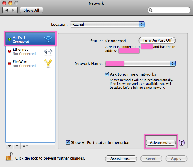 2. בלוח ההעדפות Network תקפידו שכרטיס ה AirPort בחור, ולאחר מכן תלחצו על כפתור Advanced: