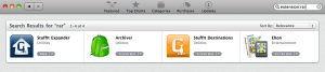 ישנם מקרים בהם תרצו לערוך חיפוש אחרי תוכנות שפותחות קבצים מסוגים שונים, גם אם כבר יש לכם תוכנה מתאימה. במקרה כזה אתם יכולים לערוך חיפוש ישירות באפסטור למק, לדוגמא: אם אתם רוצים לחפש תוכנות שפותחות קבצים מסוג rar, תכתבו בשדה החיפוש בתוכנת האפסטור: