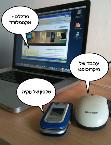 להגנתי אני רוצה להגיד ש: הטלפון הוא ישן והוא משמש כטלפון שני (והוא סגור רוב הזמן). העכבר לא מחובר למחשב הראשי שלי, הוא מחובר למקבוק פרו ישן (ואני כמעט ולא משתמשת בו). בקשר לפרללס: אתר התשלומים של ביטוח לאומי לא תומך במק.