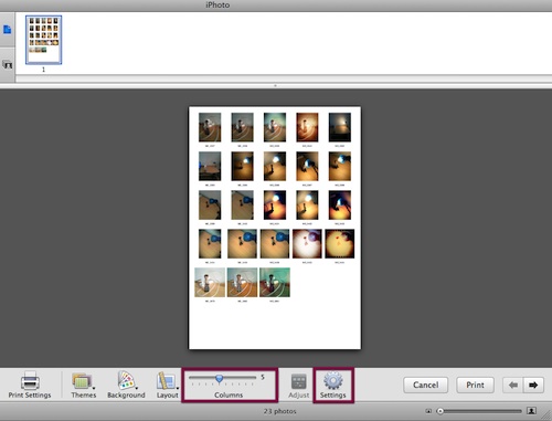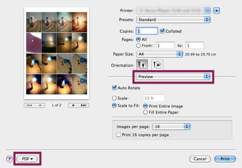 חשוב לציין, קיימת אפשרות דומה גם בתוכנת Preview: בחירה ב-SlideShow (מתפריט View), לחיצה על כפתור האינדקס, ולאחר מכן צילום המסך (השיטה הזאת מועילה אם יש לכם מספר מועט של תמונות שמצליחות להידחס לתוך המסך).