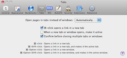 – לחיצה על מקש Command בזמן לחיצה על קישור תפתח את הקישור בטאב חדש (*ספארי, פיירפוקס, כרום). *בספארי ניתן לבטל/להפעיל את האופציה בהעדפות התוכנה + ישנם קיצורים נוספים לפתיחת טאבים: